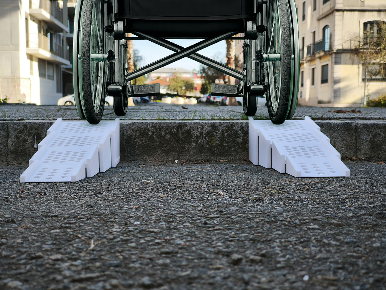 Sistema composto por módulos encaixáveis que permitem adaptar a rampa a desníveis entre 3 cm e 12 cm, garantindo flexibilidade e personalização conforme a necessidade.
